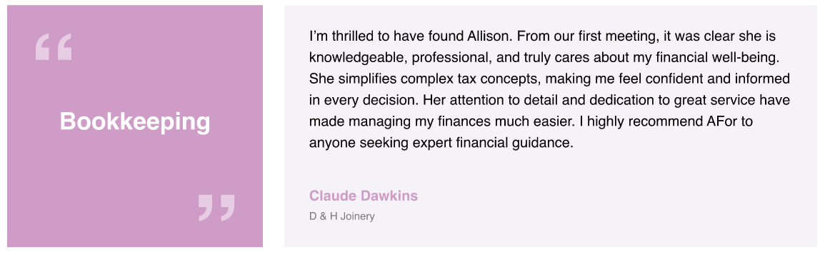 Our bookkeeping services are recommended for those who want to concentrate on other aspects of their business, without the added worry of dealing with financial matters which can often be complicated and time consuming. With AFor Accounting you can be assured that your books will be dealt with professionally and efficiently, ensuring that they are ready in time for the end of each Tax or financial year. We will collate all necessary receipts and data to ensure your accounts are completely accurate and up to date.